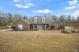 Set in the Ironhorse community, known for walkability and neighborhood amenities, this all-brick 4-bed, 3-bath home offers the space, comfort, and privacy you've been picturing on over a half-acre. A wide covered front porch makes a welcoming first impression. Inside you'll find real hardwood floors, a formal dining space, plus an additional front bonus room that flexes as an office, den, or play space. At the heart of the home, the main living area features vaulted ceilings and a cozy fireplace, flowing seamlessly into an eat-in kitchen with an island, abundant cabinetry, tile backsplash, pantry, and new stainless steel appliances. The split layout is designed for real life, offering 2 primary suites for extra flexibility. The main primary suite includes upgraded tray ceilings, 3 walk-in closets, and an ensuite bath with dual vanities, a garden tub, and a separate shower. A second spacious primary suite on the opposite side of the home is ideal for guests, multigenerational living, or a private retreat, with two additional bedrooms completing the layout. Out back, the setting elevates the day-to-day: a covered patio and expansive deck ready for weekend grilling, a fenced yard, and a storage shed/workshop for tools and projects. Best of all, the home backs to a protected greenbelt that can never be developed, creating a peaceful backdrop and lasting privacy. Practical touches keep living easy, including a side-entry 2-car garage with workspace, sprinkler system, gutters, exterior lighting, and a driveway that extends into the backyard for RV or boat storage. Ironhorse adds even more value with community features, including a gazebo, playground, and park. And when you're on the go, location delivers: quick access to I-10 at Nine Mile Road keeps commutes simple and puts shopping and dining along the Nine Mile corridor within easy reach, including Navy Federal Credit Union's Heritage Oaks location and essentials like Publix at Nine Mile Crossing.