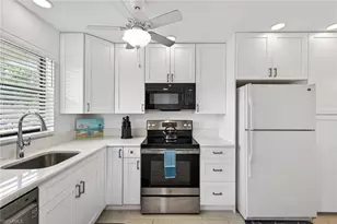 Welcome to Fairways at Par Four, a vibrant 55+ community in the heart of Naples. This well-maintained first-floor residence offers two bedrooms and two baths, highlighted by a bright, open floor plan designed for easy Florida living. The spacious living and dining areas flow seamlessly into a beautifully updated kitchen featuring crisp white shaker cabinetry, soft-close doors and drawers, and elegant quartz countertops. From your screened lanai, enjoy peaceful mornings with a cup of coffee while watching golfers pass by. The primary suite offers a walk-in closet and a private en-suite bath with a walk-in shower. A comfortable guest bedroom and full bath with a tub and shower combination provide the perfect space for visiting family and friends. Tile flooring throughout enhances both style and low-maintenance living, creating a clean, coastal feel. Residents of Par Four enjoy an active lifestyle with a wide array of amenities, including tennis, pickleball, shuffleboard, billiards, a heated community pool, and a full calendar of social events. Exciting enhancements are on the horizon, with the new Gate Golf Club expected in late 2026. This upcoming addition will feature a nine-hole public golf course, illuminated driving range, putting greens, and a bar and restaurant for casual dining and social gatherings. Ideally located just minutes from shopping, dining, and the sugar-sand beaches of the Gulf, this home offers the perfect blend of comfort, convenience, and lifestyle. Don't miss your opportunity to own a piece of sunny Southwest Florida living