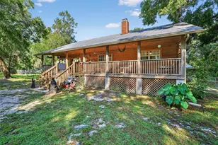Seller is offering $10,000 to buyer that can be applied toward a rate buy down or towards buyers closing costs! Cabin with land in the desired Golden Acres neighborhood-this 3-bedroom, 2-bath cabin sits on a 2.88 acre conservation lot in a golf cart-friendly neighborhood, offering the perfect balance of rustic living and modern convenience. Step inside and feel right at home with warm wood cabin walls, wood floors, and a cozy brick fireplace at the heart of the living space. The country- style kitchen feels warm and welcoming the moment you enter and is thoughtfully positioned at the center of the home and features solid wood cabinets, an island with a cooktop and bar seating, and a picture window offering views of the backyard. A generous primary suite features a large en-suite bathroom for added comfort, while two additional bedrooms and a second full bath provide plenty of space for guests or family. Enjoy peaceful mornings or relaxing evenings on the expansive country-style front deck, surrounded by the sights and sounds of nature including deer that frequent the area! Grill and chill on the expansive back deck- perfect for summer barbecues, quiet evenings under the stars, or simply soaking in the beauty of your private surroundings. Home features two versatile outbuildings - one with old rustic charm and the other offers a classic country barn style look - both offering room for storage, hobbies, or workshop space. Love animals? This property welcomes your chickens, goats, and more! perfect for those seeking a hobby farm or sustainable lifestyle. And while you'll feel worlds away, you're just minutes from town amenities such as shopping, schools, parks, and dining. If you're ready to enjoy true country living with space to roam, a welcoming community, and the comfort of a well-built log cabin, this is the one you've been waiting for. NO HOA and NO flood zone! Schedule your private showing today and come experience the charm of this unique country escape! **Property lines on photos are approx.
