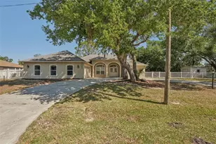 One or more photo(s) has been virtually staged. Exceptional Opportunity! No Flood Zone and No HOA. This 3-bedroom, 2-bathroom POOL HOME sits on a fully fenced double lot with a rounded driveway, offering grand curb appeal. Step inside to discover tile flooring throughout, tall ceilings, and an inviting split-bedroom layout designed for comfort and privacy. The home opens to a formal living and dining area, with sliding glass doors leading to the lanai. The primary suite, located at the right of the home, features two closets and an en-suite bathroom with a relaxing soaking tub and separate shower. The second and third bedrooms are tucked off the main living space, sharing a full bathroom. The spacious kitchen is perfect for entertaining, featuring a breakfast bar, pantry, and dinette area, all open to the family room, which also boasts sliders to the lanai. Step outside to your private pool, surrounded by lush landscaping, creating a secluded oasis. Additional highlights include an oversized garage, a storage shed, and plenty of outdoor space for entertaining and recreational toys. For peace of mind, the whole house has been replumbed. Conveniently located near parks, recreational areas, shopping, beaches, restaurants, and CoolToday Park, home to Spring Training for the Atlanta Braves.