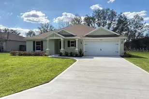 NEW HOME-Marion Oaks unit 7- Home sits on .25 Acres. Large back yard. The 3-bedroom, 2 full bath, 2 car garage home offers 1,611 living sq. ft. and 2,277 total sq ft. This home has a large separate dining room with a butler pantry that leads to the Kitchen/Great room. Luxury vinyl plank flooring in all of the home except for the bedrooms which are carpeted. Lots of windows to let in natural light. There is a covered lanai. Yard is fully sodded and landscaped with an irrigation system. Home comes with a 10-yr structural warranty. The garage offers pull down attic stairs and a garage door opener. The guest bathroom features a tiled shower and granite countertops. The Kitchen features an island and butler pantry. The owner suite gives a cozy feel with a tiled shower and dual sinks with walk in closet. This home is ready for its new owners!