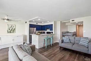 This charming one-bedroom one and half bathroom condo is adorable, ideally situated on Pensacola Beach just steps from both the Sound and the Gulf of Mexico. Enjoy stunning sunsets from the Santa Rosa Dunes dock and take advantage of one of the largest pools on the beach. As you enter, you'll be captivated by the expansive water view from the oversized balcony. Inside, the condo features new vinyl plank flooring throughout and a beautifully updated kitchen with elegant quartz countertops. Perfect for both relaxation and entertainment!