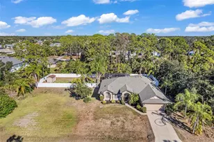 Welcome to Your Private Tropical Oasis! Perfectly situated on a rare double lot, this beautifully maintained 3-bedroom, 2-bath, 2-car garage HEATED pool home is surrounded by lush, mature landscaping that offers exceptional privacy and curb appeal. From the moment you arrive, you'll be impressed by the stamped concrete driveway and walkway and the inviting screened entryway. Inside, the home opens to soaring cathedral ceilings, porcelain and ceramic tile flooring throughout, plantation shutters, and tasteful architectural details including decorative planter shelves. With 2,276 sq ft under air, the layout offers both elegance and functionality, featuring a formal living and dining room plus a spacious family room with Bluetooth surround sound and French doors that seamlessly connect indoor and outdoor living. The kitchen is designed to impress, offering granite countertops, stylish backsplash, stainless steel appliances, a breakfast bar, pantry closet, and an abundance of cabinetry and counter space-perfect for entertaining or everyday living. The laundry room is thoughtfully designed with a washer and dryer, and cabinetry for everyday convenience. The primary suite is a true retreat with tray ceilings, a walk-in closet, and sliding glass doors leading to the lanai. The en-suite bathroom features dual sinks, a walk-in shower, jetted garden tub, and a linen closet. A desirable split-floor plan provides privacy for guests and includes two guest bedrooms, a bonus room perfect for an office/or den, and a guest bath with pool access. Step outside to your resort-style backyard featuring a sparkling heated pool with a tranquil waterfall and a screened brick-paver lanai-ideal for both relaxing and entertaining. An additional brick-paver patio beyond the lanai is ideal for grilling or gathering around a fire pit. The fully fenced backyard and tropical landscaping complete this serene outdoor oasis. Bonus SHED for extra storage. Updates include: Hot Water Heater & Pool Filter 2025, Roof 2024, Pool Heater & Leach Field replaced 2022, Shed 2019, and AC 2017. NO HOA or DEED RESTRICTIONS! This home is conveniently located in a nice neighborhood but close to restaurants, shopping, beaches and much more, this home is a must-see! Schedule your appointment today and make it yours!