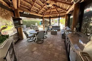 Experience luxury outdoor living on this oversized 2,868 sq ft RV lot, thoughtfully designed for comfort, privacy, and entertaining. A spacious tiki hut anchors the property and is fully equipped with electric screens and eisenglass panels, allowing you to enjoy the space comfortably in all seasons while maintaining privacy and protection from the elements. The tiki is beautifully furnished with a comfortable sofa, chairs, and a dining table, creating the perfect setting for relaxing or hosting friends. A well-appointed Char-Broil modular outdoor kitchen features a sink, cooktop, and grill, making outdoor cooking effortless. Completing the entertainment space is a built-in granite-topped TV area with sound bar, ideal for enjoying your favorite shows or sporting events while dining or unwinding under the tiki. The rear of the lot is framed by mature landscaping and large palm trees, providing a lush, tropical backdrop and added privacy. Sold fully furnished and move-in ready.