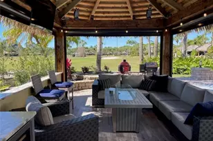 Discover the epitome of resort living on this expansive 70-foot frontage lot boasting a spacious 3654 square feet. Nestled against the picturesque backdrop of the golf course, revel in breathtaking views of the rolling hills and experience some of the most stunning sunsets the resort has to offer. Enjoy the convenience of separate parking, providing ample space for your vehicles, golf cart, and visiting guests. The meticulously crafted landscaping walls and planting beds create an enchanting oasis for gardening enthusiasts. Step into luxury with the newly constructed tiki adorned with 20-year roof fronds, complemented by decorative burnt poles, setting the stage for unparalleled outdoor entertainment. The galley-style kitchen and serving area are ideal for culinary endeavors, while electric screens add an element of convenience and comfort. Offered fully furnished with upscale furnishings and fire pit for ambiance, this property is a sought-after gem in the resort's rental program too.