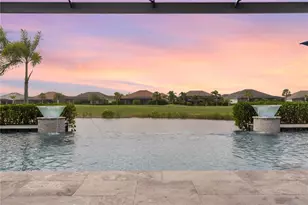 Welcome to one of the most breathtaking GOLF DEEDED homes with a CUSTOM heated saltwater infinity-edge pool and cascading water that blends seamlessly into the serene lake, showcasing an unobstructed lake & golf view on the 12th hole with NO CART PATH behind the property, ensuring serene privacy and postcard-perfect sunsets every evening. THIS HOME HAS $225,000 in custom upgrades, this residence blends refined interior selections, standout architectural features, and an extraordinary resort-style outdoor living experience that truly sets it apart from ANYTHING ELSE ON THE MARKET. Designed for those who crave LUXURY outdoor living, the expansive west-facing pool retreat was expertly crafted to highlight mesmerizing water and golf views while capturing every glowing sunset over the pond. Enjoy therapeutic spa jets that melt away tension, a stylish sun shelf with two loungers, and multicolor LED lighting that transforms the space into a glowing nighttime escape. Elevated glass water bowls add movement, sophistication, and the soothing sound of flowing water, while two built-in swim-up barstools ensure a fun and functional resort feel. Complementing the pool is a granite outdoor kitchen with premium finishes, including a marble backsplash and a high-end Blaze grill, ideal for hosting gatherings or preparing a relaxing meal poolside. Overhead, the tongue-and-groove wood lanai ceiling adds warmth and architectural richness, elevating the space to the feeling of a luxury retreat. Absolutely gorgeous chef kitchen with GE profile French door refrigerator and 42 inch cabinets, full shaker overlay and huge kitchen island with walk-in pantry. Plank tile flooring and crown molding throughout the entire house with NO CARPET. Included in the sale are the mounted TVs and wall-mount systems in the great room, den, and lanai. The floor plan flows beautifully, with CUSTOM PAINTED WALLS, beautiful light fixtures and window treatments including elegant draperies, shades, and plantation shutters, offering both spacious open living areas. With all interior furnishings and décor negotiable. This lanai was also designed for year-round protection and comfort, featuring a full Storm Smart hurricane-rated enclosure system, allowing you to secure the outdoor space with ease during storm season. Even the backyard has lush landscaping for privacy and best of all-all outdoor furnishings and décor are INCLUDED in the listing price. Even the garage has been elevated far beyond builder standard. Features include: A newly installed built-in storage wall system, Custom workbench area, Overhead safe-rack storage, Epoxy flooring for a clean, polished look and a garage refrigerator. Enjoy living in Babcock Ranch, America's first entirely solar-powered town, with access to multiple community pools, nature trails, with shopping and dining. Beautiful parks and amenities let you experience SW Florida at its finest! Come live a better life at Babcock Ranch!