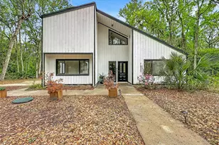 Step into timeless design with this stunning mid-century modern custom home designed by renowned St. Augustine architect Howard Davis. Nestled on almost an acre, this 3,000 sq ft architectural gem features an open floor plan with vaulted ceilings, 2 spacious primary suites (one upstairs and one downstairs), 2 additional bedrooms, and a flex space room currently used as a bedroom--offering both flexibility and function. Extensively updated in 2024, this home blends classic style with modern peace of mind: new roof (Jan 2024), HVAC, water heater, water softener, updated electric panel, new culvert and concrete entry, fully renovated kitchen and living spaces, plus major tree trimming and removal of dead/dying trees--making this property truly move-in ready. Adding even more value and versatility, a self-sustaining Airstream is positioned on the front corner of the property--perfect as a guest suite, in-law quarters, or income-producing rental. Currently, both the main home and Airstream are successfully operating as vacation rentals, offering an incredible opportunity for immediate income or multi-generational living.This one-of-a-kind property combines iconic design, modern upgrades, and endless possibilities--all set on a rare, expansive lot.