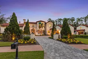 Nestled deep inside the coveted Carolwood neighborhood of Golden Oak at Walt Disney World® Resort, this nearly 11,000 sqft Mediterranean estate offers a rare combination of scale and one-of-a-kind details. Situated on a .79-acre lot, siding and backing to conservation, the home also enjoys serene pond views and ultimate privacy. Inside, soaring ceilings and a sweeping staircase set the tone, anchored by a custom crystal chandelier. A row of Disney-themed stained-glass windows adds a whimsical touch, overlooking the courtyard and sparkling resort-style pool. The chef's kitchen overlooks a two-story great room and is designed for both function and beauty, featuring top-of-the-line appliances and extensive storage inside custom cabinetry. With 7 bedrooms and 7.2 baths, including a fully detached apartment over the garage, the layout is ideal for family or guests alike. The first-floor master suite is a private retreat, complete with two gas fireplaces, a sitting area overlooking the pool, and a spa bath with soaking tub and walk-in shower. Additional highlights include a Millennium Falcon-inspired theater, temperature-controlled wine room, Toothless pizza oven, an exact replica of the marble fireplace from Cinderella's Castle apartment, and a massive game room perfect for entertaining, gaming, and/or homeschooling. Outside, the true resort-style setting is unmatched. A pool with grotto, spa, slide, and rock waterfall is complemented by multiple fire pits, expansive covered courtyards, and a summer kitchen for indoor/outdoor living. Car enthusiasts will appreciate the four separate garages, three outfitted with lifts to accommodate up to seven cars. Located just a short drive from Summerhouse and the Four Seasons Resort, this estate offers a rare opportunity to own one of Golden Oak's most remarkable residences.