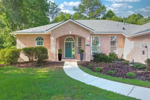 Welcome to Turkey Creek, a beautiful golf course community in Alachua, but with its proximity to 441 you can commute into and out of Gainesville easily. In addition to golf, Turkey Creek has a pool, restaurant, tennis and pickleball courts, playgrounds, and lots of walking opportunities. It is located close to San Felasco State Forest and Turkey Creek Preserve which is home to miles of hiking and mountain biking trails. If you are looking for a peaceful and large home on more than a half-acre with no rear neighbors and golf course views, this brick house in Turkey Creek is for you! With a BRAND-NEW ROOF, and everything clean and maintained inside and out, this is truly a turnkey home. Its location in the neighborhood is ideal, you can see golf happening across the street but it's not so close that you'll be worried about incoming golf balls. Behind the home is the creek so you also aren't looking at a neighbor's backyard, just trees as you relax on your wood deck. As you enter the home, you will notice the very large open living space, the 10-foot ceilings, and the gorgeous crown moldings. There is both a formal dining room and an area off the kitchen for eating your meals so you may decide to keep the front dining area a sitting room like the current owners have thoughtfully done. The large family room has views connecting it to the kitchen which has tons of cabinets and wonderful counter space, making the large area perfect for hosting gatherings. The living room and both eating areas have custom wood shelving that will stay with the home. The massive Florida room with sliding windows and two skylights runs the entire back of the home, and with the sliding doors open, really adds to the usable space in the house. It is currently set up as a living space with yet another dining area with great views of the deck and backyard. This is a split plan home complete with a large primary suite, with tray ceilings and large windows creating a cheerful place to begin your day. The en suite bathroom has a walk-in shower, separate tub, water closet, and two separate vanity spaces. There are also two walk-in closets for plenty of storage. On the other side of the home there are two spacious guest bedrooms and a full bathroom. Near the kitchen is a bright laundry room with a deep sink and lots of cabinet space. The side entry garage can easily accommodate two cars plus your storage. This home is optimal with its large lot, location within the community, great condition, BRAND-NEW ROOF, sturdy brick construction, and beautiful interior. Make an appointment to see your new sanctuary today!