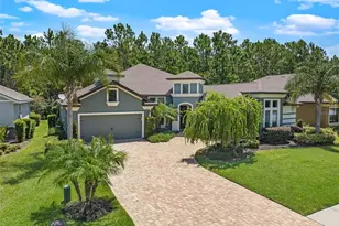 This beautifully upgraded Cameron floor plan is located on a preserve lot in the gated, golf-cart friendly community of Plantation Bay. With 3 bedrooms plus a private office, 2.5 baths, and a screened-in pool and spa under a massive mega screen enclosure, this home offers luxury living both inside and out. Once inside, you're welcomed by a spacious foyer that opens to a private office with glass French doors and wood-look tile. In hallway, there are sleek floating cabinets with a stylish pass-through, and soaring ceilings that immediately showcase the home's thoughtful design and grand sense of space. The open-concept layout showcases soaring 12-foot ceilings, tray ceiling with crown molding, and a striking stacked stone double-sided gas fireplace that serves as a dramatic focal point, connecting the vaulted sunroom to the main living area, where triple sliders and transom windows open to the lanai. The gourmet kitchen boasts 42-inch soft-close wood cabinets, granite countertops, a large island with pendant lighting, travertine backsplash, 2 year old stainless steel appliances including Bosch dishwasher, double oven range, reverse osmosis system at the sink, and a walk-in pantry with custom shelving, all flowing seamlessly into a dining space with plantation shutters and easy lanai access. Step outside to your private backyard oasis with travertine decking, a heated pool with integrated spa, and a preserve view offering ultimate privacy. Under you covered lanai is built-in prep station with ice bin, cutting board, and trash compartment makes this the perfect space for an outdoor bar or entertaining area. The spacious primary suite includes a tray ceiling, wood-look tile, plantation shutters (throughout entire home) and a luxurious en-suite with soaking tub, split vanities with granite, a walk-in shower, and a custom walk-in closet. Split floor plan with two guest bedrooms sharing a Jack-and-Jill bath with granite counters, tiled tub/shower combo. Additionally, a stylish half bath with pedestal sink adds extra convenience. The laundry room includes LG washer and dryer, sink, and 32-inch upper cabinets with additional storage space in the stop-and-drop area off the one-car garage. The 2 car/1 car split garages feature epoxy floors, and the home includes an electric hybrid water heater, whole-house water filtration and softener system, and a new AC compressor (2025). The exterior is just as impressive with a paver driveway and walkway, rock bed landscaping, professional curbing, and a split 3-car garage for elevated curb appeal. All located in GATED, golf cart friendly community of Plantation Bay Golf and Country Club. Optional memberships available to include 45 holes of private golf, 10 pickleball courts, 9 tennis courts, new 30-million-dollar Founders clubhouse, additional Prestwick Clubhouse, fitness/spa center, bocce ball, clubhouse with cabana bar and grill, and full activities calendar. Buyers of this home are to receive a substantial discount on the initiation fee at the club. Ask the listing agent for details. This is Florida luxury living at its finest, move-in ready and waiting for you!