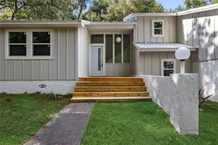 Perched atop a hill at the end of a quiet cul de sac you'll find this gorgeously renovated tri-level modern home on a massive half acre + lot. As you walk up the fern lined sidewalk, you'll notice the brand new board and batten siding, fresh paint, the new windows, new metal roof, new front porch, new designer front door and new light fixtures reminiscent of the 1980's. Open the front door to soaring cathedral ceilings and you'll begin to notice all the little details like the west elm light fixtures, new white oak LVP flooring, and so much more. The living room features vaulted ceilings, tasteful paneling, a stone fireplace, and connects the kitchen and dining room in a casual yet functional design. The kitchen offers fun new cabinets and hardware, new quartz counter tops, and Samsung stainless appliances. On this same level, you'll find a spacious office. Up a short flight of stairs you'll find two bedrooms with French and sliding glass doors opening up to a picturesque balcony, as well as a beautifully renovated guest bathroom with new double sink vanity, custom mirror, and modern bath fixtures. Downstairs you'll find a laundry room, drop zone, and this home's crown jewel - the primary suite. A massive bedroom with custom arch shelf and sliding glass door opens to a private wrap-around patio with views of the grandaddy oak tree that shades the back yard. Ensuite is one of Gainesville's nicest bathrooms- completely re-imagined with large format porcelain tiles flowing across the floors and up the walls, an oval soaking tub with wall mounted faucet, a sunken shower with rainfall shower and frameless glass wall, walls of glass leading out to a private outdoor shower area, and a walk-in closet. Also, you can't miss the massive garage with storage closet and mounted ceiling storage. This home is unlike any other on the market.