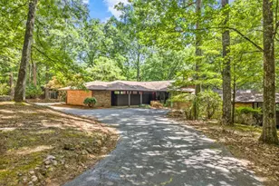 Designed by Frank Lloyd Wright Taliesin Apprentice and UGA professor Harold G. Wescott, this sprawling split level sits in harmony with the natural wooded 2.29 acre property surrounding it. This home was originally commissioned in 1964 by the late Earl and Mary McCutchen-local potters and art glass makers-who appreciated the Prairie style architecture that is so iconic of the period, which heavily influenced the mid-century modern designs. Upon entry you'll find vaulted ceilings with two-story fieldstone double fireplace made from stones sourced on the property during construction. The entry level fireplace is gas logs while the lower, den-level fireplace is woodburning. Additional features include 3 large bedrooms each with their own bathrooms (3 bathrooms) and a half bath as well as gorgeous updated kitchen with striking, earthy granite and loads of storage. The primary bedroom has nearly 270 degrees of open windows and also offers ensuite bath with a large vanity and six-yes six-closets. The living and dining areas open up onto a large patio overlooking the lovely property. Surrounded by windows, almost every nook of this home feels one with nature. The den and third bedroom open out onto a second patio overlooking the back yard. Also off the den is a very large laundry room with shelving, cabinets and extra stove outlet. Off the two-car carport is a flex space that could be used for additional storage or converted to an office, shop or craft area. And if you need two flex spaces, there is also a free-standing heated and cooled studio offering more than 225 additional square feet. The private cul-de-sac lot has so much to offer. HVAC is 7 years old. Roof is 4 years old with transferrable warranty including studio roof. Hot water heater is 5 years old. Material Disclosure: Property is being sold by Listing Agent who is also the Executor of both deceased owners estates.