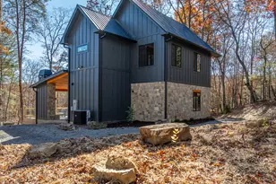 Tucked in the scenic Aska Adventure Area, this NEW CONSTRUCTION cottage offers a serene escape nestled on a peaceful peninsula of Lake Blue Ridge, all while placing you just six minutes from the boutiques, galleries, breweries, and dining of downtown Blue Ridge. Built with a premium Mountain Modern design, the exterior features a striking combination of black vertical board-and-batten siding and a heavy stone foundation, set on nearly an acre of private, wooded land. The property invites total relaxation, quiet walks, and wildlife spotting, while offering seasonal lake and mountain views through the treetops. The open-concept living area serves as a central gathering space, anchored by a beautiful stone gas fireplace with a reclaimed timber mantel and warm wood accents. The adjacent modern kitchen is a chef's dream, featuring reclaimed wood accents, Taj Mahal quartzite countertops, a farmhouse sink, a 5-burner gas range/oven, and a spacious walk-in pantry closed off by a custom reclaimed barn door. Just off the cozy dining area, the conveniently built-in coffee and wine bar offers morning brews or evening pours near the covered patio. The home features two oversized bedrooms with lofted ceilings, including a primary bedroom with expansive windows that create a true treehouse experience and an 11' 8" x 11' 5" massive walk-in closet, and the luxurious main bath, featuring reclaimed timber wind beams, boasts an oversized walk-in, tile shower, and dual vanities, blending rustic style with modern comfort. Thoughtfully crafted for all-season enjoyment, the home's expanded outdoor living amenities are unmatched, including a large covered patio with a wood-burning fireplace and fan, a stone-lined outdoor fire pit area, and a private courtyard ready for sunset soaks in the hot tub. Lake enjoyment is easy with access to two quiet coves offering a kayak launch and boat ramp, while the flat, pull-through driveway provides exceptional convenience for managing any vehicles, boats, or trailers. This short-term rental-friendly property has no covenants and restrictions, making it an ideal investment; additionally, all utilities (including propane) are buried for a neat homesite, and the home features high-speed internet wiring and dual-fuel heating. Love the furnishings shown here? They're also offered via a separate bill of sale. Discover the tranquility and convenience of this Lake Blue Ridge area escape and make this BRAND NEW, beautifully furnished, and move-in ready home yours by scheduling your private showing today!