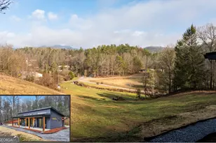 Discover rustic modern living at its finest in this brand-new home, perfectly situated on just over 3 acres with Flat Creek flowing peacefully along the property line & gorgeous year-round, both close & long-range, mountain views. Step inside to a thoughtful entry area featuring built-in mudroom/drop zone & coat closet. From here, a hallway leads to the beautifully finished guest bath w/tiled tub/shower combo & to the convenient washer/dryer closet. The show-stopping kitchen is complete w/wood beams, quartzite countertops that flow seamlessly into the backsplash, spacious peninsula with seating, chic & timeless custom cabinetry, abundant soft-close cabinets & drawers, built-in vent hood & walk-in pantry with custom shelving. The cozy yet airy great room invites you to relax with its electric fireplace set into a stylish feature wall with recessed 55" TV. Expansive 8' double sliding doors open to a serene outdoor patio where you can soak in the sights & sounds of the creek & mountains. The primary suite is a tranquil retreat featuring vaulted ceilings, its own set of double sliding doors with screens for fresh-air living & built-in pendant lighting above each nightstand. The gorgeous en-suite bath offers tiled floors, oversized walk-in shower, heated towel rack, double-sink vanity with LED anti-fog mirror & generous walk-in closet. A 2nd bedroom sits just off the main living area & enjoys its own set of double sliding doors plus convenient access to the guest bath. Enjoy the peaceful country atmosphere surrounded by farmland while still being close to local favorites like Roo Vineyards, Ellijay Mushrooms & all the shopping & dining of downtown Ellijay 5 just miles away. Add'l features include full spray-foam insulation for efficiency, low-E windows, exterior-access mechanical room & no HOA. Come see why this exceptional home is the perfect blend of modern comfort & mountain serenity. (Nearby chicken houses not operational & have been repurposed into private storage).
