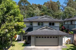 Welcome to your charming oasis in the heart of Mililani! Nestled on a serene forested rim lot, this exquisite home offers a retreat-like setting adjacent to a lush, tropical green space, providing a peaceful backdrop for your daily life. The private lanai and backyard create an inviting space to unwind or entertain while being enveloped by nature's beauty. Step inside to discover a beautifully designed open concept layout, where comfort meets style. The home features 3 spacious bedrooms and 2.5 bathrooms, offering ample space for relaxation and daily living. A versatile second living room upstairs offers additional space for a quiet retreat or a 4th bedroom. Emphasizing energy efficiency, this residence boasts 27 owned PV panels, plantation shutters, and double-paned windows, ensuring comfort while reducing utility costs. Each room is equipped with split or window air conditioning units, providing a cool haven year-round.Parking is a breeze with space for 4 vehicles, including an enclosed 2-car garage. Close to national award winning Blue Ribbon School Mililani Ike Elementary and Mililani Association Rec. Center #7, which includes its own Starbucks, a pool, tennis courts and more!