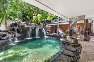 STUNNING setting OHHH so close to Kailua Beach! This 7 bedroom, 5.5 bath home has all the options for multigenerational living, with both up stairs and downstairs of the main house having 3 bedrooms, 2 baths and laundry. An additional 1 bed, 1 bath unit over the large garage and a workshop/salon. The spectacular grotto style pool has a massive waterfall and an extraordinary slide. Amazing entertainment area offers different levels of decks with or without sunshine and an outdoor kitchen with multiple bars, eating areas, pune' bed and roof top deck. Keep cool in summer with a rarely found central air system and don't think twice about the energy bill with your owned 70 panel photovoltaic system on the net metering! The location couldn't be any better with close proximity to the beach park, boat ramp, Buzzes, Kalapawai market and Lanikai! Right down the way from the Ka'ohao Charter School, situated in a quiet cul-de-sac, this home is your perfect Kailua retreat!