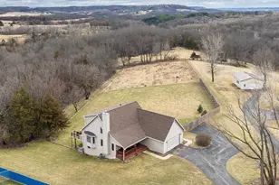 Washer and dryer are not included in sale and will be removed. Well maintained, extensively updated, and thoughtfully upgraded 4 bed, 3.5 bath rural retreat tucked at the end of a cul-de-sac on 5.23 scenic acres offering breathtaking panoramas, sweeping countryside views, and a peaceful setting just minutes outside Galena near Horseshoe Mound. Inviting covered front porch welcomes you into a light-filled main level featuring a spacious living room with soaring cathedral ceilings, cozy fireplace, updated lighting, and new carpet that flows beautifully throughout the primary spaces. The fully renovated kitchen is a true showstopper, highlighted by soft-close cabinetry, quartz countertops, custom island, stylish backsplash, newer appliances including refrigerator, stove, dishwasher, and vent hood, plus a built-in pantry, all opening to a bright dining area with expansive windows and sliding door access to the updated composite deck with sleek metal railing and added stairs, ideal for taking in the incredible views or entertaining outdoors. The main level also hosts a generous primary suite with walk-in closet and refreshed bath featuring updated vanity and fixtures, convenient laundry with access to the attached two-car garage, and a well-appointed half bath. Upstairs offers two comfortable bedrooms with added ceiling fans, a full bath, and an airy loft overlooking the living space ideal for a relaxing nook or workspace. The recently finished lower level (2023-24) dramatically expands the living area with radiant in-floor heat, a large family/recreation room, additional bedroom, full bath, and versatile flex room for office, gym, or hobbies, along with walkout access to the added poured concrete patio and backyard. Outside, enjoy a beautiful landscape with a mix of grass, meadow, and mature trees, two acres fenced, and abundant wildlife across rolling terrain. Attached two car garage provides ample space for vehicles and storage, and asphalt drive allows for plenty of additional outdoor parking. Major mechanical and infrastructure upgrades including newer furnace and A/C, radon mitigation system, whole house water filtration, updated shingles and gutters, and newer water heater provide peace of mind, while cosmetic updates throughout make this home truly move-in ready. A rare opportunity to enjoy refined country living with modern updates, privacy, and convenience in a desirable rural subdivision with easy access to all the shopping, dining and events of Galena! Covenants and restrictions apply.