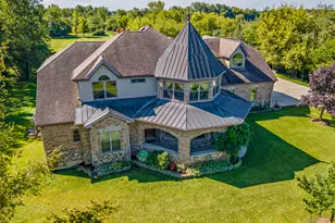 Immaculate 5 bedroom home featuring high-end finishes throughout the great open floor plan and full finished walkout basement situated on nearly 12 acres of beautifully maintained grounds with sweeping views. The grand entryway is highlighted by a spacious wrap-around brick and stone porch, and custom curved French wooden doors with brass knockers. Gleaming hardwood flooring with inlays and a curved staircase with iron spindles and wood railing greet you and welcome you into the 2-story family room with gas start fireplace and the expertly designed chef's kitchen. This impressive space features a copper island with sink and storage, dual oven, huge refrigerator, high-end oven and copper hood, finished off with a tin backsplash. The family room offers access to a deck with stunning views, a hot tub for added relaxation, and an outdoor fireplace. Back inside you have the option of a convenient breakfast nook or formal dining room to entertain guests. The main level also includes a home office and mud room, plus the vaulted primary bedroom with en-suite bathroom and 2 walk-in closets. On the massive lower level there is plenty of room for residents and guests alike - including a large rec room, game room, play room, and sunroom, in addition to extra storage space, a workshop, and walk-out to tons of outdoor space to play and relax. The large patio is surrounded by terraced landscaping and a water feature. The second level offers a spacious loft overlooking the family room, three bedrooms - 2 of which offer walk-in closets, and an inviting media room currently designed for serious music listening. With a country estate feel, you're still nearby to the historic downtown Woodstock square, shopping, dining, and the Metra train. This one-of-a-kind home is ready and waiting for its new owners! Please see Additional docs for list of Features!
