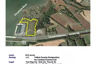 Well situated 10.5 commercial acres on Ocean Gateway just north of The Choptank River Bridge. Waiting for Maryland and Talbot County approval and funding of private sewage treatment plant. Waterfront location