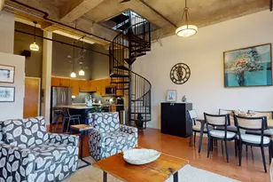 Welcome to Liberty Lofts Loft 513, the only residence currently available in this highly sought-after building. This premier top-floor, two-story loft in the historic Eaton Manufacturing building showcases industrial elegance with exposed ductwork, brick accents, and soaring concrete ceilings. A dramatic wall of windows spans the unit, offering stunning city views with automatic blinds overlooking downtown Ann Arbor. Ideally located just over a mile from Michigan Stadium and minutes from the University, hospital, restaurants, and theaters. The entry opens to a modern kitchen with granite countertops, stainless steel appliances, and a center island ideal for entertaining. The open living and dining area features hardwood floors and a gas ventless fireplace. The main-level bedroom offers another wall of windows, automatic blinds, and a walk-in closet with custom organization. A spiral staircase leads to a light-filled second bedroom with direct access to a private Trex terrace and a mini split for year-round comfort. Many major systems are new. See disclosure. Two reserved parking spaces are included, one indoor and one surface. Elevator, fitness center, and package room. Rare opportunity, schedule your showing today!