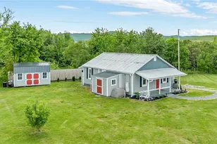 Adorable one-level cottage style home situated on 1.4 acre w/ panoramic views of open fields, wooded edges, & distance mountain ridgelines. The home's exterior features gray horizontal siding w/ white trim, a welcoming front porch w/ classic columns, & a gravel drive that leads directly to the entrance. The property includes a large backyard equipped w/ a privacy fence, a red accented storage shed to match the home, & a freestanding carport. Expansive lawn space surrounds the home, offering a wide, unobstructed view of the beautiful landscape. Inside, the home includes wood flooring & a bright & neutral color palette throughout. Enjoy a gas log fireplace in the living room, spacious one bedroom, one full bath w/ tankless hot water heater, a galley style kitchen w/ an adjacent dining area. The kitchen is equipped with contrasting cabinetry, appliances, and connects to a designated laundry space w/ additional storage. A covered back porch extends off the kitchen, leading into the yard.