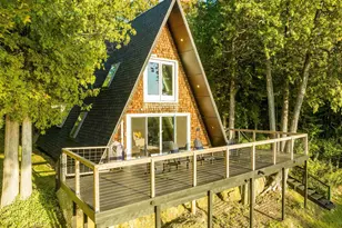 Welcome to this tranquil A-frame retreat with stunning views of Lake Champlain from both the home and spacious deck. Ideally located on over 2 acres of land with easy access to Burlington, St. Albans, Lake Champlain Islands and Plattsburgh, this property offers the perfect blend of privacy and convenience! The open-concept main level features a bright living, dining, and kitchen area with floor-to-ceiling windows that showcase breathtaking lake views. The cozy living room with beautiful wood stove is perfect for relaxing or entertaining, and the kitchen with custom cement counter tops and new cabinetry and appliances, comes fully equipped for all your cooking needs. Step outside onto the expansive deck to enjoy morning coffee, sunset views, the outdoor shower or evenings by the fire pit. The main floor also includes a bedroom and a full bath with modern finishes and laundry. Upstairs, the spacious primary bedroom offers space for a king bed and a large lake-facing window. A second bedroom includes space for another king bed, while an open loft area provides additional living space perfect for an office or sitting area. Updates in recent years include new heating system, new roof, new mini-split heat pump, updated kitchen/bath, new electrical and so much more! Enjoy year-round comfort in a peaceful and natural setting - the perfect home or lakeside getaway or potential short-term rental investment.