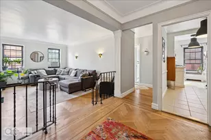 ALL THAT AND THEN SOME! This is the ultimate 1BR/1BA that literally checks off EVERY box on a discerning home buyer's list: top floor, generous layout, beautiful light, open views, exquisite period details, and lovely renovations. If it's perfection you're after, you've just found it! There's an immediate sense of space when you walk in with the foyer opening to an expansive sunken living room, complete with lovely wrought iron railings and intricate woodwork around the deco arch. The kitchen with a large eat-in area has been tastefully renovated with warm cherry wood cabinetry and open shelving, and features stainless appliances. The bathroom is a charming throwback where the beautifully maintained original features have been matched with period appropriate upgrades. The huge bedroom with enchanting morning light through a corner window has two exposures and two closets. Other deco details include stunning herringbone/hardwood floors with inlays, a unique full-size built-in bookshelf, and picture moldings throughout - folks, this is simply pure charm! The location of this art deco jewel is in one word ideal, being surrounded by parks on one of the quietest blocks of NYC, yet close to all the amenities and transportation - pretty and convenient, all in one package. Never again be bothered by noisy upstairs neighbors, so get ready to enjoy morning sunrises and quiet evenings in your new home. NB: Living room sconces are not included in the sale. EXCLUSIVE AGENT: ACCESS PROPERTY GROUP