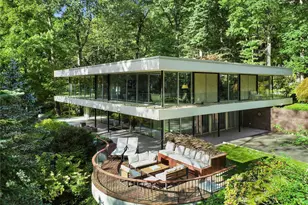 One of a kind, sophisticated Mid Century Modern home built with a unique blend of steel and stone aggregate. Designed by award-winning architect Arthur Witthoefft of Skidmore, Owings & Merrill, 9 Tallwoods has been meticulously maintained and now offered for sale for only the second time in 52 years. A statement of contemporary luxury living at its finest, nestled in the woods, this home merges indoor living with an outdoor ambience as walls of glass, a floating wrap-around terrace and a 20' domed atrium allow sunlight to stream seamlessly throughout. An open floor plan hubs around the original circular fireplace, while elegant Leicht cabinetry with state-of-the art appliances create the perfect chef's venue. The primary suite with floor-to-ceiling glass doors to the terrace and a zen-like bath with dual sinks, a Japanese soaking tub and a steam shower offers a serene getaway. Two ensuite bedrooms also access the terrace. The lower level with an expansive, open recreation room is accessed by the architectural, winding staircase. A resplendent guest suite offering an additional bedroom and adjacent living room is ideal for a live-in au-pair or guests. A fifth ensuite bedroom completes the main house. Across the heated driveway is a separate three car garage with clean and sleek lines. Located in Armonk, NY, close to highways and trains and a 45-minute commute to NYC. This is a rare opportunity for the MCM enthusiast.