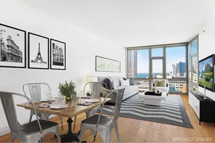 Residence 22J: A Stylish Sanctuary with Iconic Views Welcome to Residence 22J at J Condominium, a one-bedroom home that redefines luxury living. Spanning over 900 square feet, this residence offers an elegant blend of comfort and style, set against a backdrop of breathtaking views. From the moment you step inside, you're greeted by the grandeur of a 26-foot living-dining area, bathed in natural light through soundproof floor-to-ceiling windows. The vista? An unparalleled panorama of the Brooklyn and Manhattan Bridges, the iconic Lower Manhattan skyline, and the shimmering harbor. The entry foyer is both practical and inviting, featuring a spacious walk-in closet and a separate laundry room for added convenience. The open-concept kitchen is a chef's delight, boasting a sleek black granite island, GE and Bosch stainless steel appliances, quarter-sawn oak cabinetry, an acid-etched glass backsplash, and a garbage disposal. With ample storage, it's as functional as it is sophisticated. The bedroom, generously sized at approximately 17x11 feet, effortlessly accommodates a king-sized bed, bedside tables, and even a cozy home office nook. The five-fixture marble bathroom is a retreat in itself, offering a double vanity, a separate glass-enclosed shower, and a luxurious six-foot soaking tub. Additional features of this exceptional home include rich wood flooring, pantry closets, soaring 9.6-foot ceilings, and an in-unit washer and dryer. Residence 22J is where modern design meets timeless elegance, creating the perfect sanctuary.
