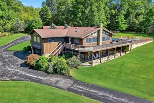 Set high on a rolling hilltop, this stunning contemporary ranch offers panoramic views that stretch for miles. From sunrise to sunset, enjoy breathtaking scenery from the expansive wrap-around deck, the private deck off the primary suite, or while relaxing by the sparkling above-ground pool. Inside, the home is filled with natural light thanks to abundant windows and skylights, creating a warm and welcoming atmosphere. The kitchen and baths have been beautifully updated, blending modern finishes with timeless style. The full, finished walk-out basement adds valuable living and entertaining space, while the attached 2-car garage offers convenience and storage. For those in need of extra space, the impressive 20' x 40' heated pole barn is fully equipped with electric and even a bathroom - perfect for hobbies, a workshop, or small business use. A gated, paved driveway leads you into this private oasis, where peace and seclusion abound. Additional unique features include a gas powered generator and a heli-pad, making this property truly one-of-a-kind. Located within the Washingtonville School District, this property offers the perfect blend of luxury, practicality, and privacy, close to commuter train and all in a prime Hudson Valley setting.