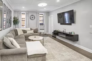 Set within the distinguished WINDSOR COOP in Great Neck Plaza, this fully renovated 2-Bedroom / 1-Bath home offers a masterful blend of classic architectural elegance and contemporary design. A spacious foyer greets you upon entry, revealing abundant closet space, refined crown moldings, and custom cabinetry - each detail executed with impeccable craftsmanship to balance style and functionality. At the heart of the residence, the open-concept kitchen showcases a dramatic waterfall-edge island with seating, quartz countertops that flow seamlessly into the backsplash, premium stainless steel appliances, and bespoke cabinetry. Designer pendant lighting adds a striking visual element, creating a space equally suited for casual meals or elegant entertaining. The adjoining living and dining area continues the home's cohesive design, featuring recessed lighting, sophisticated light fixtures, wide-plank flooring, and the timeless charm of crown moldings. From the living room, expansive windows frame striking park views toward the main courtyard, filling the space with natural light. The bathroom echoes the refined aesthetic with quartz finishes and a dedicated makeup vanity, while the generously sized bedroom comfortably accommodates a king-sized bed. The WINDSOR offers a lifestyle of distinction, complete with manicured gardens, a grand restored lobby, modernized elevators, and a smart video intercom system accessible via mobile devices. Amenities include a state-of-the-art fitness studio, Wi-Fi-equipped and elegantly designed laundry facilities, secure bike storage, individual storage units, a package room, Amazon lockers, and the attentive service of a live-in superintendent. Cats are welcome. Love where you live - where prewar sophistication meets the convenience and comfort of first-class modern living.
