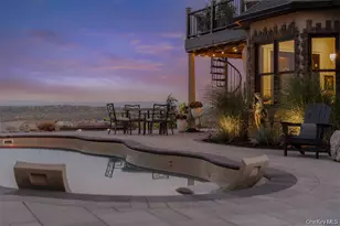 Perched high above the Hudson River with panoramic views set on 3.9 private acres, this custom-designed single-level estate embodies refined modern luxury. Clean architectural lines, dramatic finishes, and meticulously curated details create a residence that feels both sophisticated and effortlessly livable. The current layout lives spaciously, with the flexibility to easily convert to additional bedrooms, offering additional versatility without compromising the home's elegant flow. A custom entry door opens to a striking foyer that leads into a sun-drenched chef's kitchen designed for both everyday living and elevated entertaining. Quartz countertops, bespoke cabinetry, an oversized statement island, pot filler, gas range, wine refrigerator, and expansive prep space anchor the room. The open-concept design continues into a light-filled dining area and expansive living room, where floor-to-ceiling accordion glass doors fully disappear to reveal uninterrupted Hudson River views and breathtaking east-facing sunrises. The outdoor experience is nothing short of resort-like. Thoughtfully designed across lush landscaped grounds, the property features a stunning inground pool with water features and slide, a stacked-stone outdoor bar with changing room and bath, a custom-built fireplace, hot tub, sauna, and outdoor shower. A romantic secret garden retreat with its own fireplace and starlit patio offers a private sanctuary, while the grounds also include a playground, vineyard with grapevines and fruit trees, a detached barn, and beautifully hand-laid stone walls that weave throughout the property. Multiple terraces, a covered porch, and a Juliet spiral staircase with balcony create countless vantage points to take in the landscape and river beyond. Inside, a spacious guest bedroom shares a beautifully appointed full bath, while the luxurious primary suite serves as a serene retreat with private exterior access, a spa-inspired bath with double vanity and rainfall shower, and an expansive walk-in closet. A two-car garage provides ample space for vehicles and storage, while a walk-up partially finished attic offers the opportunity for a den, office, or additional living space. Privately gated with extensive hardscaping and generous parking, this extraordinary Hudson River estate delivers a rare combination of architectural beauty, privacy, and lifestyle, with the added opportunity to easily convert to a three-bedroom configuration for those seeking additional space.