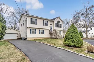 Welcome to this well-maintained high ranch built by Paramount Homes and lovingly preserved by its original owners. This inviting residence offers a thoughtfully designed floor plan featuring three generous bedrooms and two impeccably maintained bathrooms, creating an ideal balance of personal space and shared living areas. The bright kitchen features honey-toned oak cabinetry with decorative hardware, distinctive blue countertops with matching backsplash, and white appliances including a dishwasher and range. A sunny window above the sink overlooks the yard, while the convenient layout provides ample counter space for meal preparation. Display cabinets with glass doors offer an elegant touch for showcasing treasured dishware. The welcoming living room is centered around a large palladian window with an elegant half-moon arch, draped with soft blue fabric that complements the blue area rug below. Comfortable tan sofas and accent chairs create a cozy conversation area, while the warm hardwood floors add natural warmth throughout. A handsome wooden entertainment center provides both storage and display space, anchoring the room. The exterior presents crisp white vinyl siding with contrasting navy shutters and a graceful front staircase leading to the main entrance. The neatly maintained yard features evergreen landscaping, a curved stone retaining wall, and a gravel pathway, providing excellent curb appeal. A generous driveway leads to the detached two-car garage with electric service, perfect for vehicles and additional storage. Built just 21 years ago, this Paramount Homes original combines practical living spaces with thoughtful architectural details like the distinctive arched windows and classic trim. The split-level design offers separation between living areas while maintaining an open, connected feel. Experience the comfort and value of 76 Edgewater Drive, where proximity to Osprey Park provides opportunities for outdoor recreation just minutes from your door.