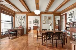 This stunning Classic Six is located in the renowned pre-war co-op at 645 West End Avenue, a masterpiece by esteemed Italian architect Gaetan Ajello. Apartment 9C features two spacious bedrooms, plus a staff room or home office, along with 3 bathrooms. The formal dining room is warm and inviting, showcasing original wood-paneled walls and beamed ceilings. French doors with their original one side of mahagony and the other of oak lead into the living room, where oversized windows, elegant moldings, and high ceilings add to the charm. Both bedrooms are generously sized, with the primary bedroom facing east over West End Avenue, allowing natural light to pour in. The en-suite bathroom features a standing shower. The second full bathroom is beautifully appointed with a deep soaking tub, a wood and marble vanity, a stained glass window and classic subway-tiled walls. The large windowed kitchen has been thoughtfully preserved, featuring modern cabinetry, stainless steel appliances, a deep-soaking sink, ample storage, and a separate butler's pantry. Just off the kitchen, the original maid's room with a full bath is tucked away from the other bedrooms, making it a perfect private space for a home office, guest room, or cozy den. This inviting home is completed by hardwood floors, high ceilings, pre-war details, original moldings, and stained-glass windows. In-unit washers and dryers are permitted with board approval. The impeccably maintained, full-service, pet-friendly building offers a 24-hour doorman, a live-in superintendent, newly updated common hallways, a rooftop gym with new equipment, a bike room, storage rooms, and a beautifully landscaped roof deck. 645 West End Avenue stands as one of the most distinguished residential buildings on West End Avenue, known for its turn-of-the-century craftsmanship and attention to detail. 5% flip tax on net profit. Built in 1912 by renowned Italian architect Gaetan Ajello, this Turn Of The Century treasure holds a prominent and distinguished place on West End Avenue. Designed on a grand scale this prominent residence offers an abundance of pre-war details such as, an attended elaborate lobby with soaring ceilings and marble details. The apartments feature very high ceilings (10 to 12 feet), handsome oak paneled and beamed ceilings in the dining rooms, stained glass windows and decorative moldings throughout. Although the building appears massive in size, it is an intimate building with only 72 units. The building residents can enjoy a magnificent landscaped roof garden and gym/exercise room on the rooftop.