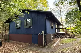 Privately set Mid Century Modern Ranch home on a dead end lane. Ideal starter home or Your Weekend getaway. This home is surrounded by woods which allows for quiet seclusion yet convenient to restaurants, shopping, pharmacy and a beautiful Town park for the community to enjoy fishing, hiking trails, biking trails, picnicing etc. The home features 2 bedrooms and 1 bath, hardwood floors with an open dining/kitchen and living room with fireplace overlooking a wrap around deck well maintained with plenty of room for gathering of friends or solitude. There is the opportunity to expand the square footage in the lower level which has the potential of being finished into two additional bedrooms and one bath subject to obtaining proper permits. This home is in an HOA called Emerald Green which has New pools, tennis courts, pickleball courts, clubhouse, boating, fishing, swimming etc. Annual dues are $1831 can be paid monthly or yearly. There is a special assessment yearly of $725 until 2033. Buyer to pay transfer fee of 0.7 % of the sale price to Emerald Green at closing.