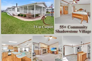 Welcome to easy living in Shadowstone Village, Palmyra's sought-after 55+ community! This well-maintained 3-bedroom, 2-bath double-wide home offers comfort, convenience, and thoughtful updates throughout. Step inside to a spacious living room featuring a natural gas fireplace, perfect for cozy evenings. The kitchen boasts ample cabinetry, recently installed appliances (all included), and plenty of prep space. Enjoy natural gas heat and central air-both installed in 2021 and serviced annually for peace of mind. Outdoor spaces shine with a covered front deck and a side awning-covered patio, ideal for relaxing. The attached 1-car carport plus two additional off-street parking spaces provide plenty of room for vehicles and guests. Ramp access ensures ease of entry. This move-in-ready home has been lovingly maintained, featuring a roof installed in 2006, insulated skirting with vents, a shed with electric, and newer replacement windows (2019). The hot water heater was replaced in 2009, ensuring continued efficiency. Enjoy the friendly atmosphere and community amenities of Shadowstone Village while living in a home that's been cared for and updated for your comfort. Don't miss this opportunity-schedule your showing today to see this pet friendly home on a quiet cul-de-sac street that offers a nice parking lot for overflow parking for guests.