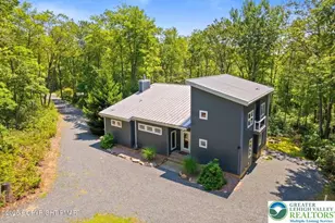 Elite custom-built 3 bed/2 bath Mountain Modern home with gorgeous open concept great room, central AC, forced air heat, & flowing contemporary design for sale in Pleasant Valley West! New HVAC system installed in 2024! Located on a cul-de-sac-accessed private 1.26 acre lot, this home is sure to impress with the striking vaulted ceilings, floor-to-ceiling fireplace, bamboo floors & high end finish! The gourmet kitchen features quartz countertops, stainless steel appliances, & breakfast bar seating! Unwind in the open dining area with striking views through the wall of windows into the wooded surroundings! Spacious main floor primary suite with double vanity, separate shower stall, soaking tub, & toilet closet. 2 additional bedrooms & full bathroom on the main floor. The oversized loft is perfect as a second living area or family room, with enough space for everyone! Relax on the rear deck (refreshed with Trex decking 2023) or second story loft balcony! French drain installed on the north side of property 2024! Be sure to enjoy Pleasant Valley West's lake & beach! Minutes from hiking, biking, rafting, downtown Jim Thorpe, Hickory Run State Park, & more! Great commuter location to PA-476 & I-80! See today!