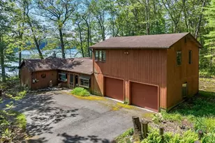 Experience the ultimate lakefront living with this Twin Lakes property set on 1.4 private acres, offering panoramic views that will take your breath away! This rare gem features 4 spacious bedrooms, including a private primary suite with a full bath, plus an open living and dining area with a cozy wood stove, all overlooking the serene lake. Just off the living room, you'll find a kitchen, laundry room, and a charming screened porch perfect for relaxation. The 2-car garage and paved circular driveway add ample guest parking, while the expansive decking and bluestone walkways lead you straight to the lake, where you can enjoy spectacular sunrises with lake views from almost every room. Property being sold fully furnished (inside & out) and includes the sailboat, rowboat, paddle boat, canoe, grill and water bike. Community amenities include: a beach steps from the property, pickleball, tennis & basketball courts.