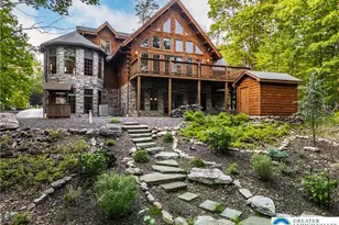 Discover a rare opportunity in the private, amenity-rich community of Eagle Rock Resort, just two hours from both New York City and Philadelphia. This striking custom log home sits on 1.29 wooded acres, delivering both privacy and space in a serene mountain setting. Thoughtfully constructed with high-quality materials and timeless design, this beautiful residence blends rustic craftsmanship with modern functionality. Soaring 20' cathedral ceilings, exposed beams, and hand-selected hickory wood floors define the main level, where a Viking commercial-grade kitchen and spacious open-concept living areas are designed for gathering. Two wood-burning stone fireplaces, a sunroom with custom antler chandelier, grand living room with stone fireplace and wet bar set the tone for elevated yet comfortable living. Step outside to curated landscaping that invites year-round enjoyment. A new bluestone patio with masonry firepit and curved seating wall sits adjacent to a koi pond with waterfall, all bordered by mature trees and seasonal color, offering incredible panoramic views. Eagle Rock Resort offers incredible onsite amenities include an 18-hole championship golf course, 9-hole executive course, fine & casual dining, golf shop, ski & snow sports, outdoor swimming pools, indoor aquatic center, spa & fitness center, equestrian center, activity center w/ basketball court, walking trails, 24/7 gated security & more. Additional parcels included in the sale: 03-U5S6-002-184; 03-U5S6-002-186.