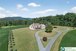 Back on the market due to unforeseen family circumstances - don't miss this rare second opportunity to own a stunning retreat overlooking Hawk Mountain! Situated on 15+ private acres with panoramic views in every direction. Enjoy spectacular sunsets through floor-to-ceiling living room windows and peaceful sunrises from the covered front porch. Three brick patios offer ideal outdoor entertaining space. Acreage is currently leased annually to a local farmer (soybeans, sunflowers, wheat). Continue lease for added income, subdivide (verify with township), add outbuildings, create a vineyard/hobby farm, or preserve the privacy. Open-concept great room features custom wood-burning brick fireplace with oversized mantel. Flows into dining area and beautifully appointed kitchen with crown molding, glass-front cabinetry, cabinet lighting, built-in microwave shelf, and large center island. Spacious laundry room with custom cabinetry (potential walk-in pantry). Private primary suite at rear with sunset views, walk-in closet, and full bath. Three additional bedrooms and three additional full baths. Attached garage with staircase to unfinished space above (future expansion potential). Basement offers finished office/possible 5th bedroom with nearby full bath plus additional unfinished space ideal for rec room or in-law suite. A true lifestyle property offering privacy, flexibility, and unforgettable views.
