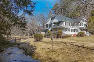 Charming, unique, a grand country home. Overlooking a gently flowing stream, this spacious home offers ample living space but never ceases to feel cozy with thoughtful moments. A flagstone walk leads from the road to a flagstone front porch, then into the home's expansive living room featuring both a beautiful coal stove and wood burning fireplace with lovely brick surround. Recessed lighting augments the abundant windows, including a lovely bow. The home's eat-in kitchen offers ample room for gathering and food preparation with access to a covered side porch, overlooking the stream. A half-bath and laundry room are set within the kitchen. Down a few steps from the living room is a grand formal dining room, wood beamed ceiling and wood wainscoting are adorned with custom wallpaper matched in the drapes. A bay window overlooks the stream, and French doors lead to a third porch and steps to the yard. Built in, illuminated display cabinets flank the doors. Upstairs, a dedicated Master offers abundant closets and spacious ensuite, its tall windows overlooking the stream. A second Master could also be an ideal family room; French Doors lead to balcony with county views. Two additional bedrooms and two flex spaces offer abundant potential! Beyond the lovely stream, the home is surrounded by grounds of lush lawn dotted by mature trees, secluded yet within reach of every convenience. With Central AC and a newer roof this grand country home and its idyllic setting are calling to you!