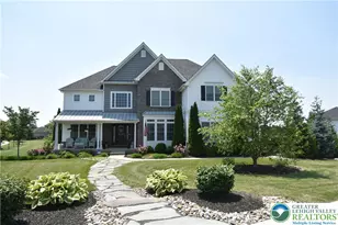 Amazing 5 bedroom 4.5 bath Preakness Farmhouse located on a one acre manicured lot. Situated in Saratoga Farms, this Tuskes-built home is next to lower Nazareth Community Park. Walk up from the architecturally designed landscape and sidewalks to the front porch. Enter the home to a magnificent foyer with an open staircase, hardwood floors, oak treads, and wrought iron balusters. First floor office has glass French doors, formal living room with crown moldings and detailed trim. The home offers an amazing gourmet kitchen with wolf six burner cooktop, double oven, and stainless steel refrigerator, spacious center island with quartz countertops and custom cabinetry. Coffee bar and serving area adjoins the formal dining room. Breakfast room opens to a 2 story family room, beautiful 2 story full stone fireplace, and 2nd staircase. 2nd floor offers 5 spacious bedrooms with 3 full baths. The primary bedroom suite includes large bathroom with center soaking tub, flanked by his and her vanities, walk-in shower, and a spacious walk in closet. Finished lower level offers 2nd entertaining family room, entertaining kitchen, exercise room, full bath, and double wide exit to rear yard and patio. This home is magnificently landscaped throughout with upper level deck with pergola and canvas awning coming down to custom designed stamped concrete, patios, ample seating areas, and firepit. Oversized 3 car garage and exterior storage building. Open House Saturday (8/23) 1-3pm.