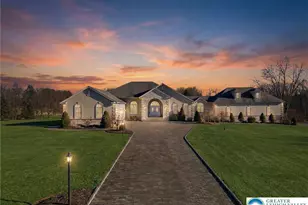 Set on 12.75 acres in Bushkill Twp within the Nazareth Area School District, this custom ranch estate offers approximately 5,400 square feet of finished living space with rare infrastructure and privacy. A long private drive creates separation from the road before arriving at a single-level residence designed for scale and functionality. Approximately $550k in improvements modernized the interior with oak hardwood flooring, upgraded lighting, and cohesive contemporary finishes. The renovated kitchen features marble and granite countertops, oversized center island, double ovens, and Italian porcelain flooring. Vaulted living spaces and a formal dining area with propane fireplace provide flexibility for entertaining and everyday use. The primary suite spans over 37 ft in depth with sitting area and redesigned bath including soaking tub, dual-head shower, and marble double vanity. Secondary bedrooms and baths have been updated with modern tile and fixtures. The finished lower level adds approximately 1,700+ square feet of recreation and flex space with radiant heat. Attached and detached garage structures provide enclosed parking for five vehicles with additional driveway capacity. Outdoor features include paver patios, stone steps, fire pit, in-ground pool, and landscaped grounds. Portions of the acreage are enrolled in Act 319 and subject to preservation guidelines. A private estate offering scale, modernization, and land value with convenient access to major commuting routes.