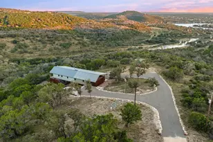 Perched above the rolling hills and limestone outcrops of the gated Wolf Creek Ranch community, this home by LOWDO captures vistas of valleys, trees, and ridgelines near Lake Buchanan. Designed to harmonize with its surroundings, the residence rests on a steel pier-and-beam foundation, minimizing land impact while maximizing views, light, and airflow. A private drive leads through 23.07 acres where free-ranging cattle maintain the property's Agricultural Exemption. Wildlife is abundant. The home features a 29,000+ -gallon rainwater collection system capturing about 2,510 gallons per inch of rainfall, with a complete filtration system. Built on a south-to-north orientation, it is solar-array ready for future off-grid use. Entry through an exterior "potting room" foyer transitions from outdoors to in. An open-air courtyard floods the interior with natural light and breezes. The main level includes Reform Cabinets from Denmark, engineered wood flooring, and a slider window to a bar and carport area. Sliders on nearly every wall open to wraparound porches with panoramic views. Covered porch square footage is 1750 sqft. The living area features a STUV fireplace. Constructed with foam-insulated walls and ceilings, 2x6 framing, red iron beams, and exterior NickelGap siding, Galvalume silver, corrugated steel, and Corten steel with perforated Galvalume detailing. There is a seperate entrance for the bottom floor. Enjoy sunsets, misty mornings, the Lake Buchanan HOA dock, ATV access to cliffs with easement to Morgan Creek, and the East Lake Buchanan Boat Ramp five minutes away. Designed for sustainability, this Wolf Creek Ranch retreat offers elevated Hill Country living in balance with nature.