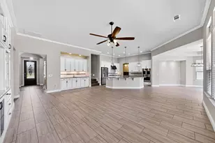 Immaculate 2-Story Ashland with Stunning Features This like-new, young 2-story Ashland offers timeless curb appeal with a striking herringbone brick and stone facade. The oversized garage features a mud sink, side entry door, daylight windows, and a wireless keypad. Step through the elegant Glass Craft front door into a circular foyer that opens into a grand living space combining the living room, kitchen, and dining area. Interior highlights include 12x14 ceramic tile and plush carpeting, a built-in media center, and a wet bar with upper and lower cabinetry. The chef's kitchen is a showstopper with an island with seating, Café appliances-including a gas cooktop, double ovens, microwave, and French door fridge-maple cabinets with roll-out drawers, quartz countertops, an apron front sink, tile backsplash, under-cabinet LED lighting, and soft-close drawers. A butler's pantry and spacious walk-in pantry complete the space. The dining room comfortably seats 8-10 and includes a charming nook for your favorite furniture piece. The primary suite features a bay window, patio access, crown molding, and a luxurious bath with a soaking tub, dual sinks, a separate shower with an assist bar, and a walk-in closet connected to the laundry room. A second primary suite includes a private bath with tub-shower combo, vanity, and medicine cabinet. The home office is enhanced by a built-in desk and ample storage. A well-lit staircase leads to a flexible upstairs space that can be used as a game room, bedroom, or both-complete with a full bath, plantation shutters, barn door, and walk-in closet. Enjoy outdoor living on the extended, east-facing patio with a gas hookup for a future outdoor kitchen and TV package. Additional features include a whole-house surge protector, wireless security system, variable-speed HVAC fan, and generous under-stair storage.