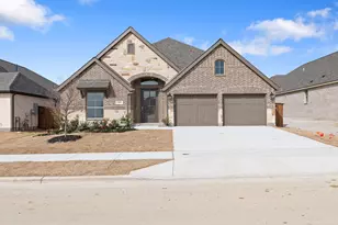 Home office with French doors set at entry with 12-foot ceiling. Extended entry leads to open kitchen, dining area and family room. Kitchen features corner walk-in pantry, generous counter space and island with built-in seating space. Dining area flows into family room with a wood mantel fireplace and wall of windows. Primary suite includes double-door entry to primary bath with dual vanities, garden tub, separate glass-enclosed shower and two large walk-in closets. A guest suite with private bath adds to this spacious one-story home. Covered backyard patio. Mud room off two-car garage.