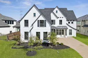 This curated residence located in the gated community, Hills of Kingswood, was designed intentionally to set a dramatic tone in every room. Starting with the high-impact kitchen which is anchored by a black quartz waterfall island with a brushed brass coiled-spring faucet. Kitchen backsplash impresses with a full-height bookmatched tile wall, creating a seamless and luxurious statement complete with floating kitchen shelves, decorative white vent hood and matte-black sconces. Main living space is defined by a dramatic floor-to-ceiling feature wall, complete with sleek electric fireplace and 2-story decorative lighting - emphasizing the room's soaring scale. Additionally, a sliding glass door system blurs the line between indoors and out, offering incredible natural light and an effortless flow for entertaining. Formal dining, lounge and bar areas continue the curated aesthetic, boasting a striking brushed brass globe chandelier over the lounge space & a woven pendant dining chandelier which softens the adjacent dining nook with its organic texture. Primary suite is a statement unto itself, with marble-inspired tile flooring and coordinating accent wall. En suite bath impresses with freestanding tub, dual vanities with black marble counters, and dual-headed shower. Spacious primary closest completes the space with direct laundry access. Main floor also boasts a dedicated office, offering flexibility to serve as a guest suite, with access to a striking secondary full bath finished in bold patterned tile and designer wallpaper. Upstairs, along with 3 beds & 2 full baths, opens to an expansive retreat with three distinct living areas. Offering endless opportunities for customization; whether envisioned as media, game, library, workout, second office, or playroom, this versatile space adapts to every lifestyle. Incredible location with quick access to scenic walking trails, Lake Lewisville, Legacy West, The Star, and Frisco's premier dining and shopping destinations.