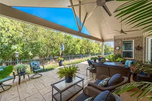 Stunning golf course lot home situated on the 15th hole in fabulous Frisco Lakes 55+ active adult community. This home features an expansive back patio, an ideal outdoor oasis with stamped concrete, ceiling fans, and a built-in kitchen that enhances the outdoor living experience, providing a tranquil setting to enjoy morning coffee or host friends. Upon entry, the dining room sets the tone for the home, flowing seamlessly into the inviting living room, ideal for entertaining and everyday living. Large windows throughout fill the space with natural light, highlighting the home's elegant details and creating a warm atmosphere. The chef's kitchen is a focal point, featuring sleek white cabinetry, a five-burner gas stove, quartz countertops, and a large island that serves as both a prep area and gathering spot. The kitchen flows into the spacious family room, where a wall of windows brings the outdoors in, creating a cozy, relaxing atmosphere. Just off the family room is a well-appointed office with custom-built-ins for both functionality and style. The home also includes two generously sized bedrooms, each offering privacy and comfort. The primary bedroom retreat has a luxurious ensuite bathroom with a vanity and a spacious walk-in closet with custom built-ins, offering plentiful space and organizational options that make it a standout feature of the home. A two-car oversized garage and an additional golf cart garage provide generous space and ample room for all your needs. This home offers the perfect combination of luxury, convenience, and active community living in a highly desirable neighborhood. Frisco Lakes by Del Webb features golf, a serene lake, pickleball courts, a beach ball area, and a clubhouse perfect for gatherings and events.