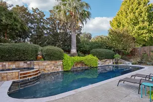 Beautiful home in Highland Village featuring a backyard designed for relaxation and entertainment. This 3900 plus square foot property offers an inviting pool with waterfall, palm tree, and a dark blue pool finish that enhances the water color and clarity. The kitchen includes freshly painted cabinets, counter height quartzite counters, and a spacious island that provides ample workspace and seating options. The floorplan includes 5 bedrooms, with one currently set up as a game room or bedroom, offering flexible use of space. The primary suite features a bay window overlooking the backyard and pool. Upstairs are 3 additional bedrooms and a loft that can serve as a play area, study, or additional living space. Dual staircases include a curved front staircase and a convenient secondary staircase near the kitchen with easy access to the backyard. This home offers comfortable indoor living with great outdoor amenities for gatherings or everyday enjoyment.