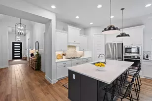 This beautiful Perry Home features $60,000 in thoughtful upgrades and updates. When you step through the door, you're immediately greeted by 13' ceilings adorned with two chandeliers, illuminating the beautiful board & batten woodwork that graces the hallway. The heart of the home, the chef's dream kitchen, boasts beautiful quartz countertops and ample storage space. Designed with both practicality and style, it features a corner walk-in pantry, an inviting island with built-in seating, and modern pendant lighting that adds a touch of sophistication. Flowing seamlessly from the kitchen is the dining area, leading into the family room, where a modern, 3 panel glass slider door opens up the entire space to the outdoors, flooding the room with natural light. Custom shades, operable by remote, provide both privacy and ease of use. Adjacent to the kitchen is the second living or game room, featuring a stylish A-frame ceiling adorned with a natural wood beam and French doors for added privacy. The bright and spacious primary suite offers a tranquil retreat. The primary bath, featuring dual vanities, a garden tub, a separate glass-enclosed shower, and two walk-in closets, is accessed through a double-door entry. Additional bedrooms boast walk-in closets, ensuring ample storage for all your needs. The mudroom off the garage provides convenience for entering and exiting the home. The sellers have gone the extra mile by adding a new Tesla charger, water softener, and whole- home filtration system. Step outside to the covered backyard patio, ideal for entertaining on hot summer days, featuring misters and a sleek 72-inch black ceiling fan to keep you cool and comfortable. The professionally landscaped yard includes mature trees along the back fence for privacy, crushed granite and large paver entry steps with lighting, and evergreen plants that create excellent curb appeal